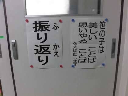 続いて看護当番の教員から今週の生活目標「最後まで 美しく」についての話がありました。「身の回りを美しく」「廊下や階段の歩き方を美しく」「あいさつをうつくしく」の3つです。1学期のまとめとして、生活場面を振り返り、美しさを大切に過ごしましょう、と子どもたちに伝えました。