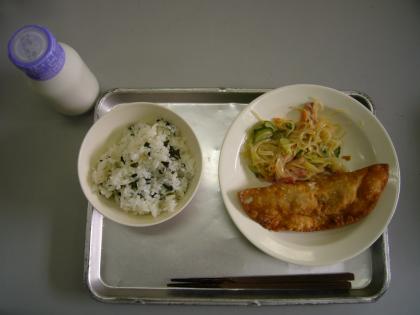 10月29日の給食は、子どもたちの大好きなジャンボ餃子でした。入学式のとき、在校生のあいさつの中で取り上げられるほど人気があり、今年度の給食試食会のメニューにもなりました。写真でもおわかりのように、皿いっぱいの大きさです。口に入れるとパリッとした皮の中から肉汁が出てきます。給食室の鍋は、家庭用に比べとても大きいです。そのことを活かし、鍋の中に一つ一つていねいに油の中に入れ、パリッとしたジャンボ餃子が出来上がりました。