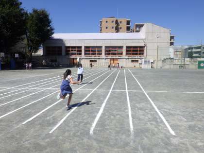 校庭に出てきた子が、白いラインを見つけて走り出していました。
