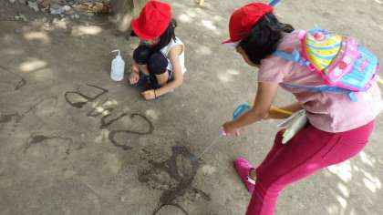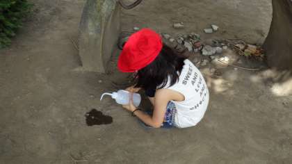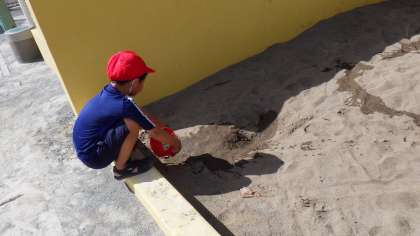 砂遊びをしている子どもたちです。水で砂に絵を描いたり、泥だんごを作って遊んだりしました。砂や泥を実際に手で触ったり、できたものを見合ったりして、楽しく活動しました。最初は、汚れるから…といいつつも、いざ始まってみると、泥だらけになって遊んでいました。