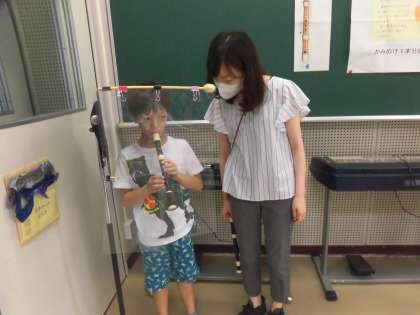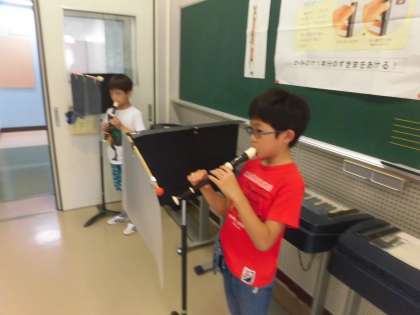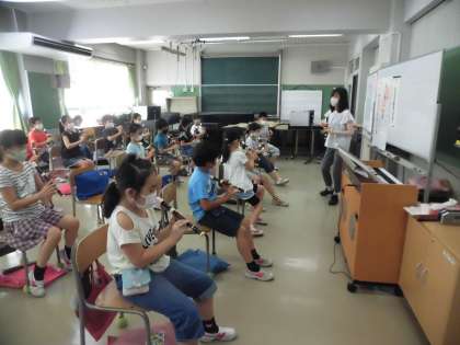 音楽の学習「リコーダーのひびきをかんじとろう」2学期になり、待ちに待ったリコーダーの練習が始まりました。基本の持ち方や息の出し方を学習し、今日は、「シ」と「ラ」の音を出す練習をしました。感染症対策として一人ずつパーテーションで区切られた中で順番に練習していました。
