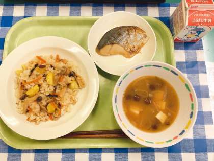 今朝はぐんと気温が下がり、少し肌寒い朝でしたね。だんだんと秋めいてきました。今日はそんな秋を感じる、「秋の香りごはん」です。さつまいも、くり、きのこなど、秋においしい食べものが入っています。もりもり食べて、食欲の秋にスタートをきりましょう。