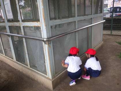 答えにびっくりした1年生は、さっそく休み時間に飼育小屋に行ってウサギの顔をのぞき込んでいました。興味津々です!