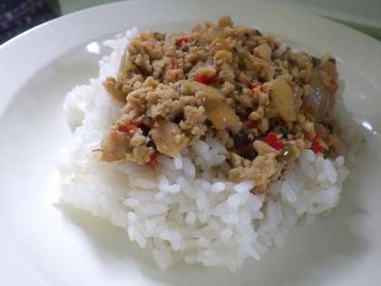 給食の配膳の時、通りかかった調理員さんに「タイの料理ですよ。」と教わってびっくりです。給食ではじめて食べる「ガパオライス」。おいしくいただきました!