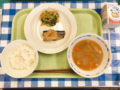 今日は秋の味覚のさんまです。さんまは漢字で「秋」「刀」「魚」と書きます。秋が旬で、刀のようにするどいかたちからきています。今日はシンプルにさんまのおいしさを味わえる塩焼きにしました。おいしさも栄養もたっぷりです。