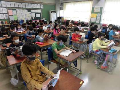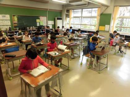 子どもたちは、学級文庫の本や自分で用意した本を、自分の席で静かに読んでいます。また、学級担任は、子どもたちの健康状況をカード等で確認し、一日の学校生活が始まります。