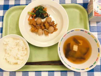 食べ物は、大きく3つの種類に分けられることを知っていますか?「体を動かすエネルギーになるもの」「体をつくる材料になるもの」「体の調子をととのえるもの」です。今日の給食でいうと、ごはんは「体を動かすエネルギーになるもの」、鶏肉とうずらの甘辛煮は「体をつくる材料になるもの」、即席漬は「体の調子をととのえるもの」です。みそ汁は、3種類の食べ物がすこしずつ入っています。バランスよく食べるようにしましょう。