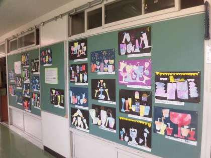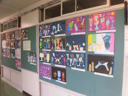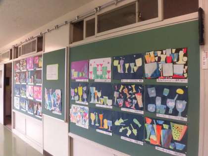 3年生が図工の時間に取り組んだ作品「おしゃれな グラス」が、教室廊下の掲示コーナーに展示してあります。