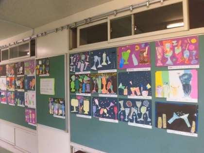 図工「おしゃれなグラス」の学習で制作した作品を各教室廊下に掲示してあります。形や大きさ、色合いを考えながら作りました。カラフルできれいなグラスが並んでいます。学校公開期間にご来校の際、ぜひ鑑賞してください。
