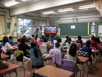 事前に運動委員会の5・6年生が実際に様々な跳び方を撮影し、今日はその動画を各学級で視聴しました。