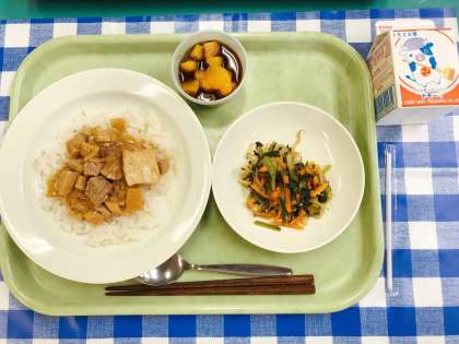 今日はオリ・パラ給食で、台湾の料理を紹介します。ルーローファンは、豚肉を砂糖やしょうゆでやわらかく煮込んで、煮汁ごとごはんにかけて食べる料理です。チャオチンツァイは、にんにくの風味がきいた青菜の炒め物です。空芯菜でつくることが多いです。豆花は豆乳をかためた豆腐のようなものに、甘いシロップとさまざまなトッピングをかけて食べる台湾のデザートです。今日はフルーツと黒蜜をかけました。