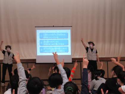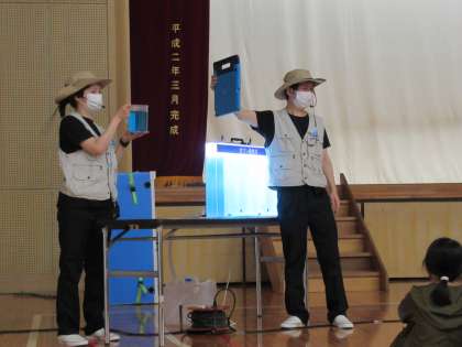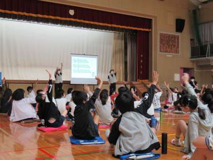 本日、1・2校時に体育館で、東京都水道局より派遣された「水道キャラバン」による出前授業を実施しました。社会科「水はどこから?」で学習した、水道水が蛇口に届くまでの流れについて、クイズや実験等を交えて、詳しく復習しました。