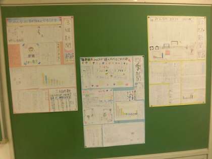 *写真は、4年3組の掲示コーナーで発表されている作品です。1組・2組も同じように作品が発表されています。子どもたちは、互いの作品を見合いながら、これからにつなげる工夫点などを話し合っています。