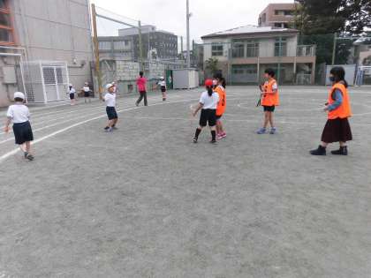 校庭では、5・6年生の運動委員会のみなさん(オレンジ色のビブスを着用しています)や担任の先生が、跳び方や回数を確認して、縄跳びカードの跳び方の欄にサインをしていました。