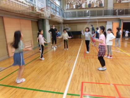 曇り空で、時折小雨が降ってくる今日の午前中ですが、中休みには予定通りに校庭・体育館・屋上を使って、学年に割り振られた場所で、短縄跳びを全校で楽しみました。
