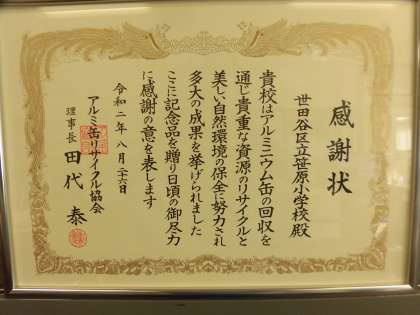 10/20 PTA「アルミ缶回収活動」への感謝状