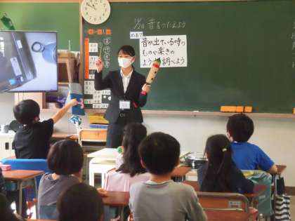 本日、理科の「音をつたえよう」の単元で、教育実習生による学習指導がありました。