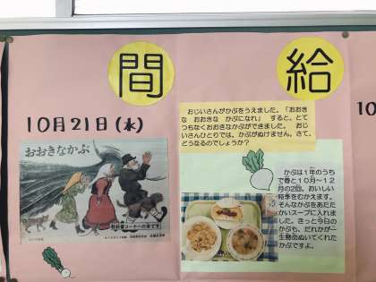 読書週間3日目は、「おおきなかぶ」という絵本を紹介しました。1年生の教科書にも載っているお話なので、知っている子も多いようです。いつもよりたっぷりのかぶをスープに入れましたが、かぶのやさしい味わいで体の温まるおいしいスープになりました。渡り廊下の掲示物を見て、楽しみにしてくれている子もいました。