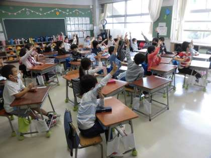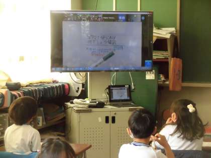 委員会の子どもたちの発案でオンラオイン・システムのZoomを使って、クイズ形式で行いました。学校生活で使っている身の回りのものが、各教室の大型テレビモニタに映し出され、ヒントとともに三択で答える楽しい集会になりました。
