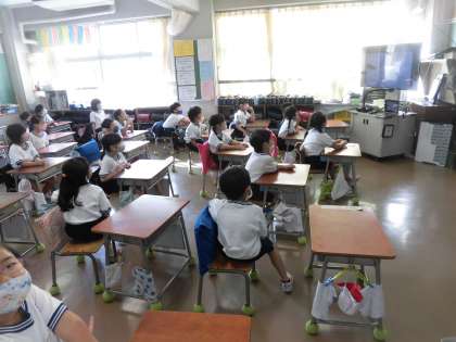 集会委員のみなさんは音楽室から画像を送り出題し、各教室の様子を見ながら出題を進めていきました。回答する子どもたちからは、「何だろう?」「きっとあれだよ!」などの反応があり、正解したときはとても嬉しそうな表情を見せていました。