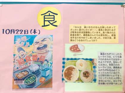 読書週間給食4日目は、「給食番長」という絵本を紹介しました。この本は、印象的な絵に注目がいきますが、内容もとてもよい本です。給食以外にも学校にかかわる内容のシリーズがありますが、子どもたちにつたえたい内容が上手に書かれています。