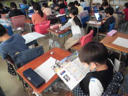 総合的な学習の時間「世界に広げよう!ともだちのWA!」の学習で国調べをしています。調べる国は、アメリカ、ニュージーランド、そして、2年生の時に調べられなかった韓国の三カ国です。「有名な場所はどこかな。」「人気があるスポーツは何だろう。」「へぇーそういう意味があったんだ。」「日本と違うな。」・・・新しい発見をしている3年生たちです。