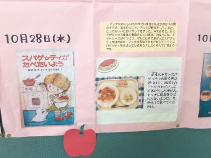 読書週間8日目は、「スパゲッティがたべたいよう」という本を紹介しました。お話の中で、おばけのアッチがお腹ペコペコになってしまった、エッちゃんのトマトスパゲッティ。そんなスパゲッティを目指して作りました。