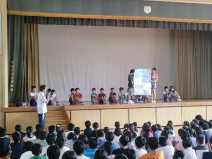 今日の児童朝会では、季節の変わり目についてと虹についてのスピーチ(6年生)がありました。毎回、表示をいろいろと工夫しています。今日からプール(水泳指導)が始まります。児童朝会の後、続いてプール開き朝会を行いました。プールでの約束事の確認で6年生がお手本をしてくれました。何より安全第一で、プール指導を実施していきます。