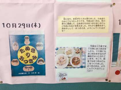読書週間給食9日目の給食は、「十三夜給食」でもあります。「たぬきのおつきみ」という本を紹介しました。