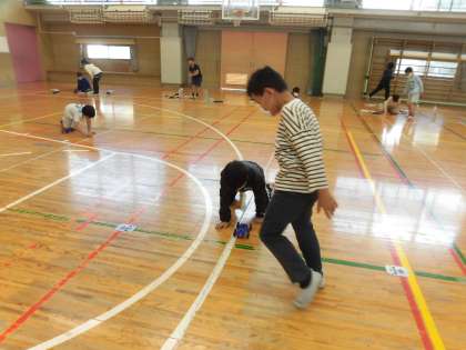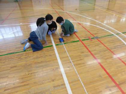 ゴムの伸びを5cm、10cm…と変えると、車の走る距離はどのように変わるのか、広い体育館でゴムカーを思いっきり走らせて調べました。