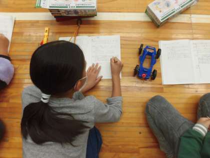 初め、5cmで走らせたときにも、「結構走る!」と喜んでいましたが、最大距離の15cmで試して、5cmのときよりもはるかに遠くまで車が走る様子を見て、「すごい!」と大喜び。ゴムの伸びが大きいほど、縮む力も大きく、ものを動かす力も大きくなることを実感をもって学びました。