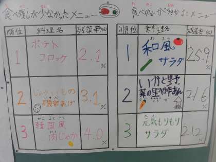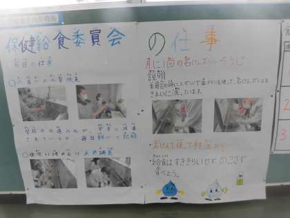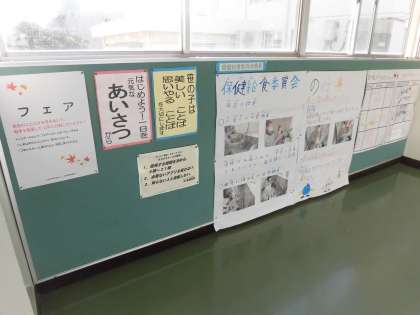 2階渡り廊下の掲示コーナーに、保健給食委員会のみなさんが児童集会で紹介したい活動報告と残菜調べ報告が掲示されています。