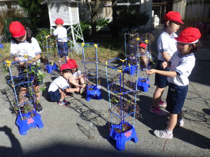 さすがに晩秋になりツルも弱ってきましたが、いざ支柱を片づけようとすると、1年生の力では支柱にからみつくツルを手で切ることができませんでした。
