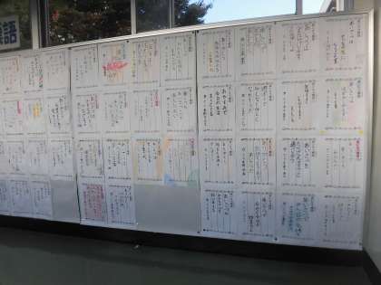 11月の「あいさつ週間」を担当する4年生のみなさんがつくった「あいさつ標語」が、2階渡り廊下の掲示コーナーに発表されています。