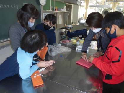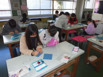 刺繍にもだんだん慣れてきてはやくなり、糸や針の扱いも上手になってきました。フェルトのふちをかがり縫いして、ボタンと紐を付けたら完成です。小物入れの完成を目指して、今日も熱心に取り組んでいます。終わってしまった子は、花ふきんも作りました。