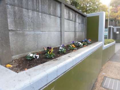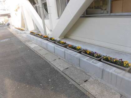 先週、地域の方々が、耐震補強工事を行った北校舎南側にはプランター植で、正門脇のコーナーに、そして東門の花壇にパンジーなどの美しい花を植えてくださいました。