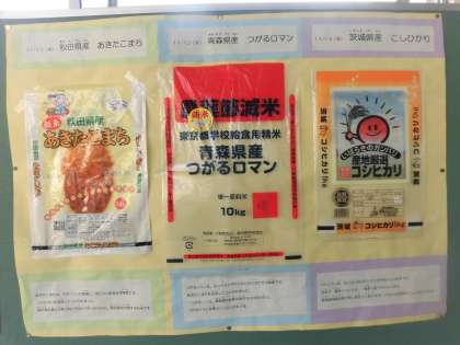 3日間の給食で子どもたちに提供した新米について、栄養士が資料とともにまとめ、2階渡り廊下の掲示コーナーで3種類のお米(新米)について紹介しています。
