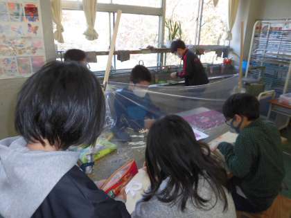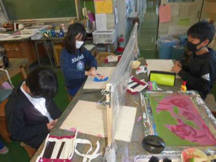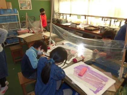 木版画の色刷りが進んでいます。オリジナルの色づくりをしたり、塗り方を変えたりしながら、すてきな1枚になるよう工夫を重ねていました。裏にもう1枚掘り始めた子どももいて、すてきな作品は、もっともっとでき上がりそうです。
