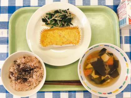 今週は、「○○の秋給食」として、「○○の秋」にまつわる給食を出します。今日は「芸術の秋」です、絵を描くときにいろいろな色をつかって、いろいろなかたちをかくように、給食でも、いろいろな色、いろいろなかたちの食材をつかいました。赤飯の赤色、ゴマの黒色、卵焼きの黄色、ほうれん草の緑色、豆腐の白色…豆の丸いかたち、豆腐のしかくいかたち、にんじんのさんかくのかちなど、たくさんの色やかたちをみつけてみてくださいね。