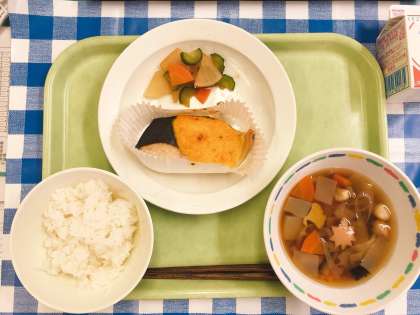 今日は「紅葉の秋給食」です。もみじ焼きとは、色づくもみじのように、赤く焼いた料理のことです。いちょう切りは、その名の通り、野菜をいちょうの形に切ることです。和食はこのように、季節や自然を表わす言葉が多いのがすてきですね。こづゆは、福島県の郷土料理です。笹原小学校のまわりも、木々がきれに色づいていますね。ぜひ給食でも外でも、紅葉の秋を楽しんでください。