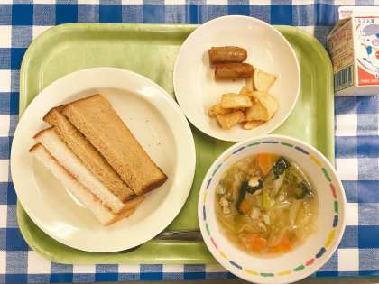 今日は「行楽の秋給食」です。暑すぎず、寒すぎず、紅葉もきれいな秋は行楽にぴったりの季節です。今日はピクニックにもっていきたくなるようなメニューの給食にしました。公園や山の上でシートを広げて、お弁当箱を開けたような気持ちで食べてみてくださいね。