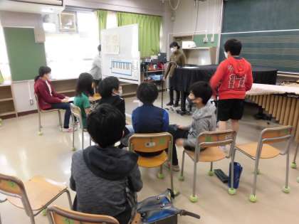 話し合いで、3つのヒントから学校にある物を当てるクイズを出すことに決まりました。1年生がまだ見たことのない物もあるかもしれないとのことで、zoomを使って行いました。写真のように、音楽室からタブレットを使って配信しています。