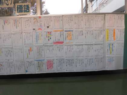 12月のあいさつ週間を担当する3年生のみなさんが「あいさつ標語」をつくり、2階渡り廊下の掲示コーナーで発表されています。