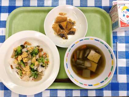 今日は郷土料理給食で、「佐賀県」の郷土料理を紹介します。「須古ずし」は、お祭りやお祝いの時に食べられるおすしです。四角い箱に酢飯をしきつめ、むつごろうや卵、しいたけなど地域でとれた食材をきれいにかざります。「だぶ」は、お祝いや悲しいことがあったときなど、村の人が集まって作っていた汁ものです。水を多く入れて“ざぶざぶ”つくることから、なまって“だぶ”と呼ばれるようになったそうです。