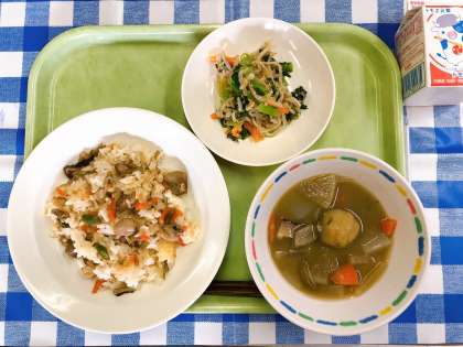 今日は郷土料理給食で、大分県を紹介します。とりめしは、全国的にも有名な大分県の郷土料理です。鶏肉とごぼうを甘辛く煮て、ごはんにまぜて作ります。ほかの材料や作り方は、家庭によってさまざまです。武者汁は、魚のすり身をだんごにしたものが入ったみそ汁です。漁師のだんご汁ともいわれたそうです。