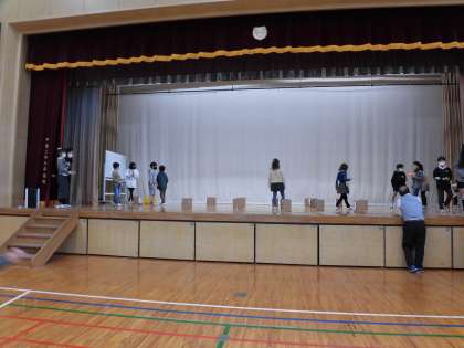 体育館のステージで、段ボールを狙ってボールを投げます。得点が貼ってあり、合計得点が計算されました。