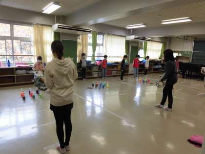 2班は、「めざせ高得点わなげ大会」です。手作りの輪っかをペットボトルを狙って投げます。ソーシャルディスタンスをとってゲームをしていました。