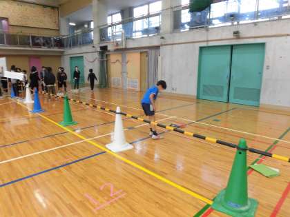 体育館で、丸めた新聞紙を遠くまで飛ばしていました。お店の係の人が、何メートル飛ばせたか教えてくれました。