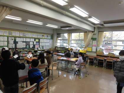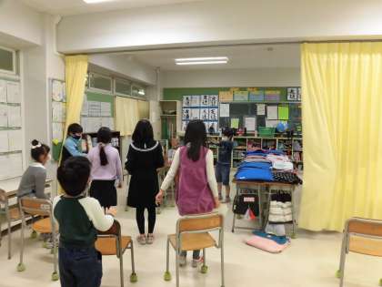最初に見た教室の様子と、カーテンをひいてから次に見た様子の違いを答えます。本など細かいところの変化を見つけて答えていました。