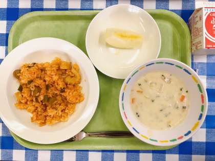今日はオリ・パラ給食でアメリカ合衆国の料理を紹介します。ジャンバラヤとは、鶏肉やソーセージの入った、トマト味のスパイシーな炊き込みご飯です。パエリアに似ていますが、ジャンバラヤの起源はパエリアだといわれているそうです。